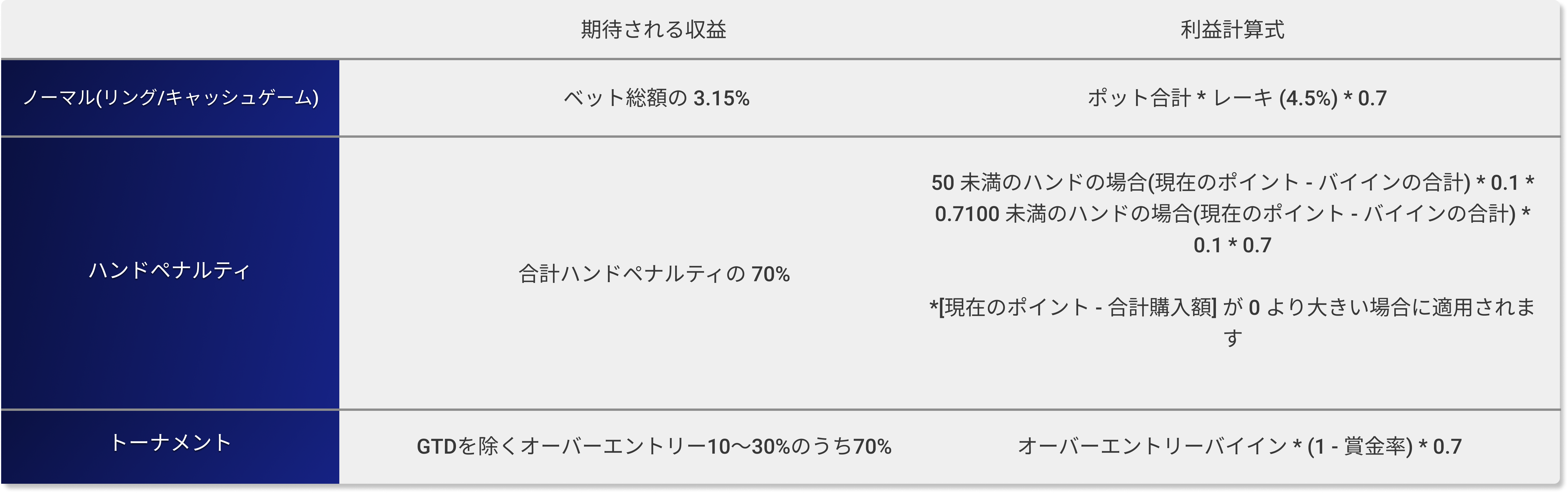 ルームでプレイされたハンド数が50未満の場合、利益(バイイン額を除く)の15%が差し引かれ、100未満の場合は10%が差し引かれます。