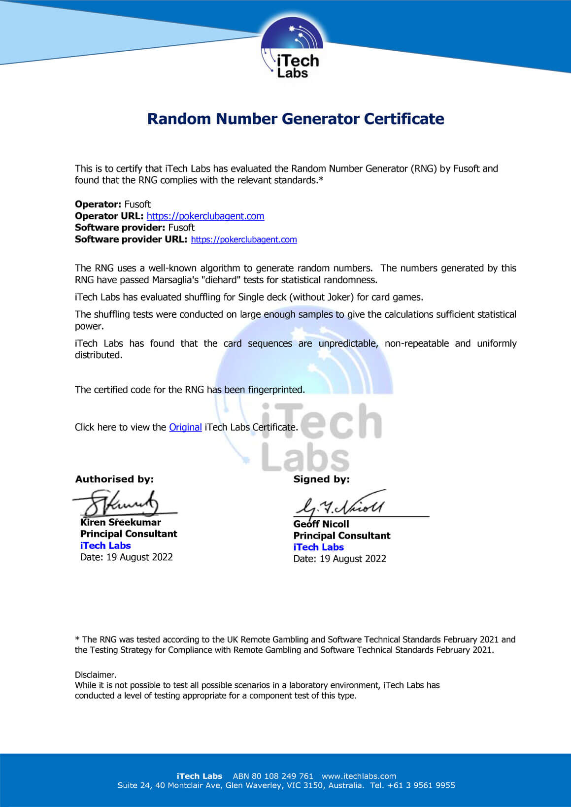 RNG (Random Number Generator) Certified by Revolution Hold 'em iTechLabs