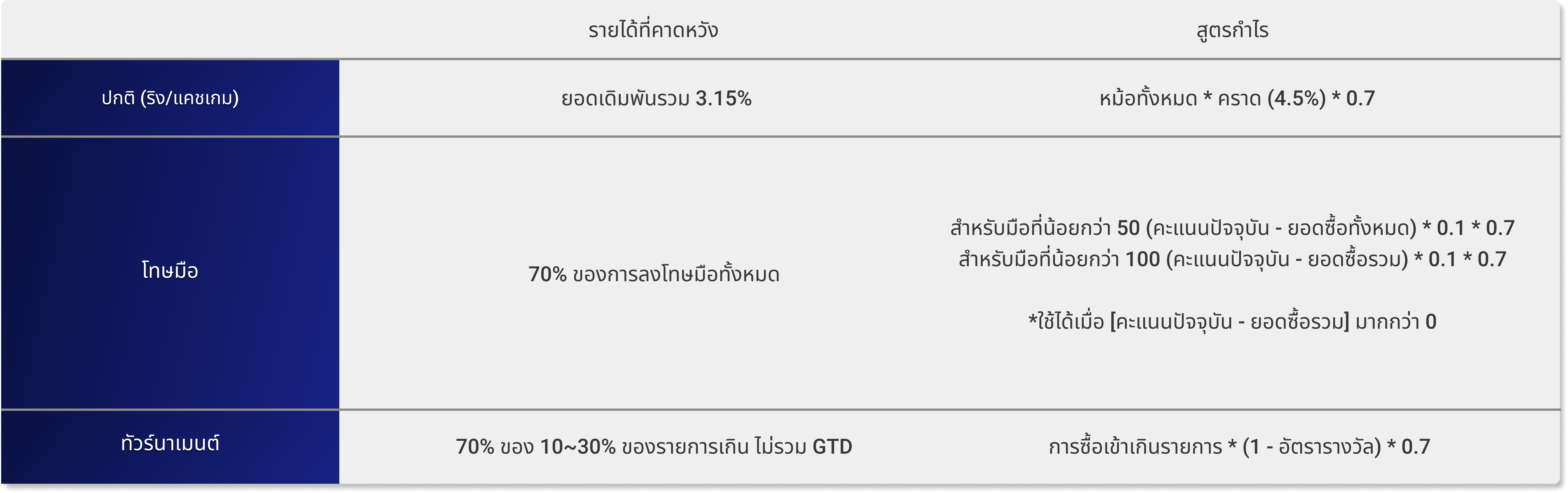 เมื่อผู้ใช้ซื้อเข้าเกม Hold'em คะแนนจะถูกหักตามจำนวนที่เล่น หากผู้ใช้ชนะในเกม คะแนนในเว็บไซต์คาสิโนจะเพิ่มขึ้น