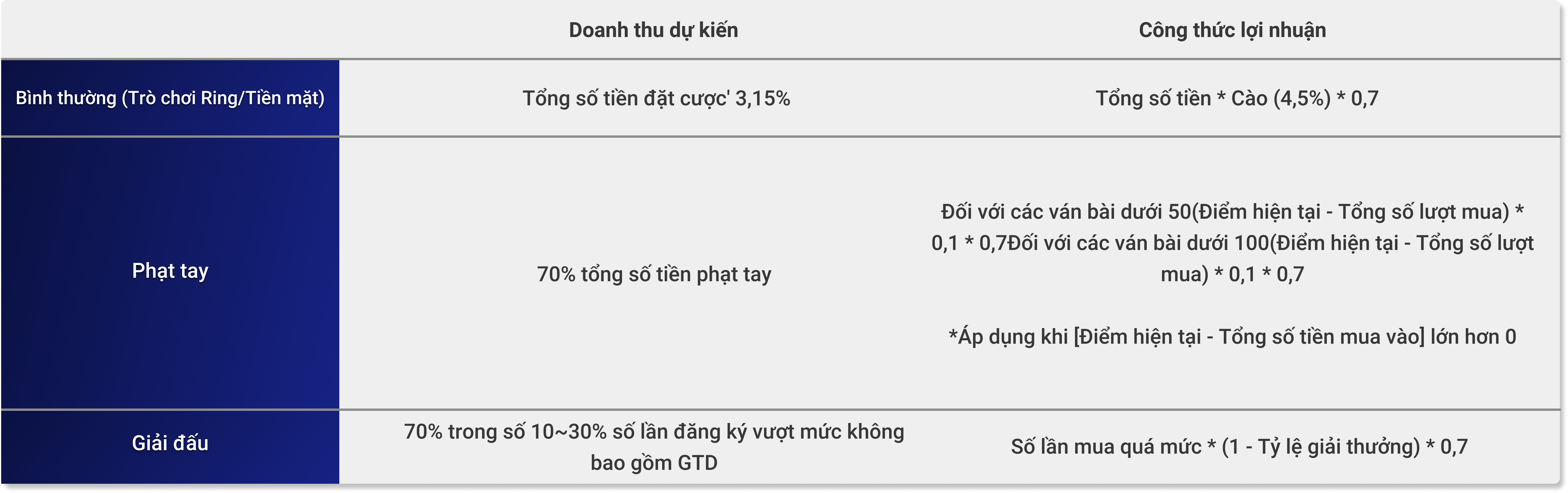 Các trang casino thường lấy 70% doanh thu tạo ra từ Doanh Thu Chơi Game Ròng (GGR), như đã giải thích trong trang trước. Vì hệ thống Rake tạo ra doanh thu cao nhất cho Revolution, chúng ta sẽ sử dụng Rake làm ví dụ: GGR được tính ở mức 3.15% tổng số tiền cược của tất cả người chơi (tương ứng với 70% của 4.5% Rake).